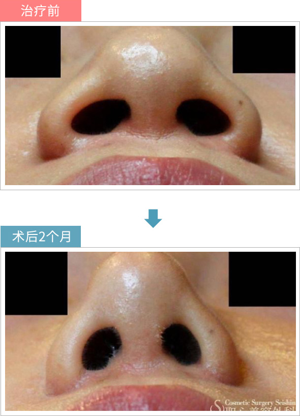 効果 此为调整鼻翼向两旁扩大的俗称“塌鼻子”形状的手术。通过与假体植入隆鼻术的组合治疗,可使鼻部整体的印象变得清晰。