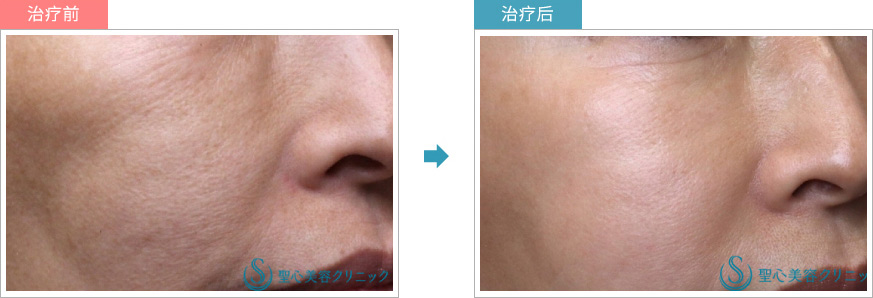 顾客在意面颊的细纹和毛孔。除了肝斑以外,面部也看起来颜色暗沉。接受PICO皮秒淨肤和PICO皮秒爽肤的治疗2次后,细纹减少,毛孔也变得不明显。肌肤看起来有弹性,肝斑及面部暗沉的问题也有改善,因此顾客仍然定期会来院接受治疗。
