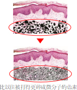 以往的激光治疗是通过激光的光热除去黑色素。「Discovery pico(探索皮秒镭射)」不是通过热,而是利用冲击波打碎黑色素。被打碎成微颗粒的黑色素,被巨噬细胞吞噬之后通过淋巴管消失。这个微颗粒越小,吞噬细胞的吞噬功能被激活有助于顺利吸收,可迅速消除色素。还有一个特点就是,很少发生色素沉着等炎症后的并发症。